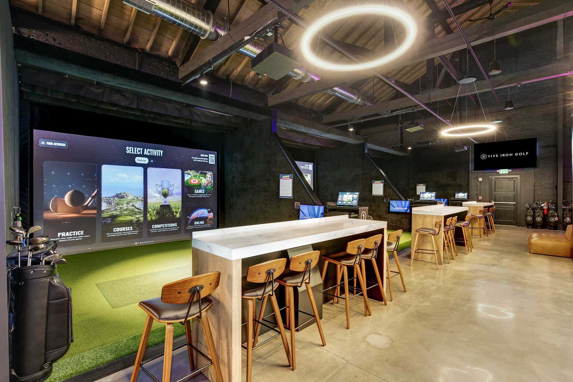 Located in Baltimore’s Harbor East neighborhood near the Inner Harbor and Fells Point, Five Iron Golf offers a state-of-the-art golf experience in a bustling part of the city. Recently renovated, golfers of all levels can enjoy top-tier Trackman simulators, lessons, and a full-service bar. We also have darts and shuffleboard!