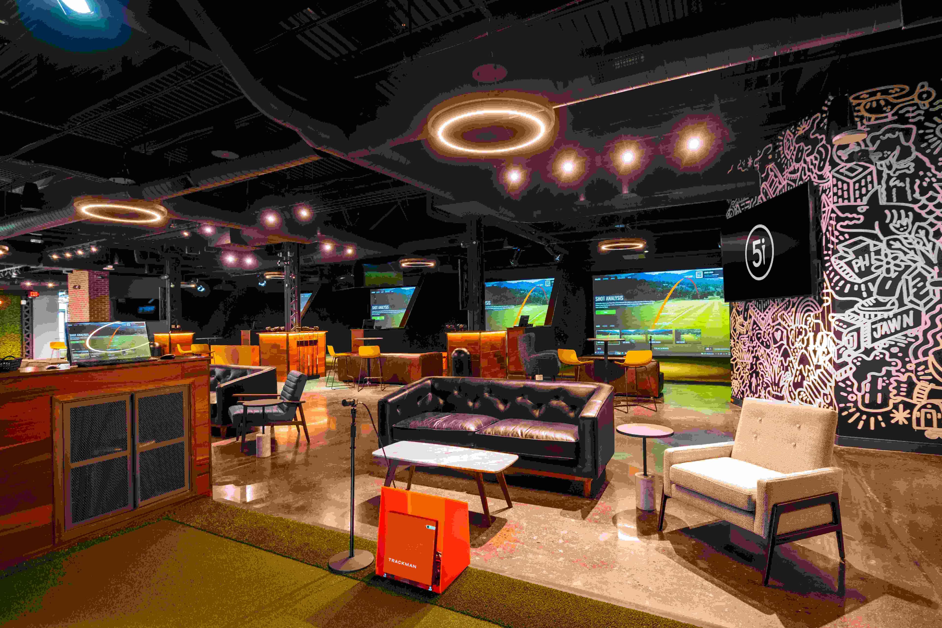 Located in Philadelphia's Northern Liberties neighborhood near Fishtown, Five Iron Golf is an all-in-one golf & sports bar featuring a variety of ways to play and practice. Enjoy great dining and a full-service bar regardless of your golf expertise. Some visit Five Iron Golf to improve their game, working with highly-trained golf coaches to get a Swing Evaluation, personalized lessons, or a Tour-level club fitting. Others cheers to a fun night out with friends. Compete in fun mini-games or play a round of 18 on world-class PGA Tour venues like Pebble Beach and 200+ other famous courses. Enjoy weekly events, from afternoon Happy Hour to late-night specials. Or, become a member for 90 mins. of free golf everyday along with complimentary coffee and breakfast. Book an indoor golf simulator bay today for you and up to 5 friends. 5i is also the perfect event venue for corporate outings, celebrations, and just an excuse to get the gang together. Discover a new golf bar experience in one of Philly's most creative and energetic neighborhoods at Five Iron Golf.