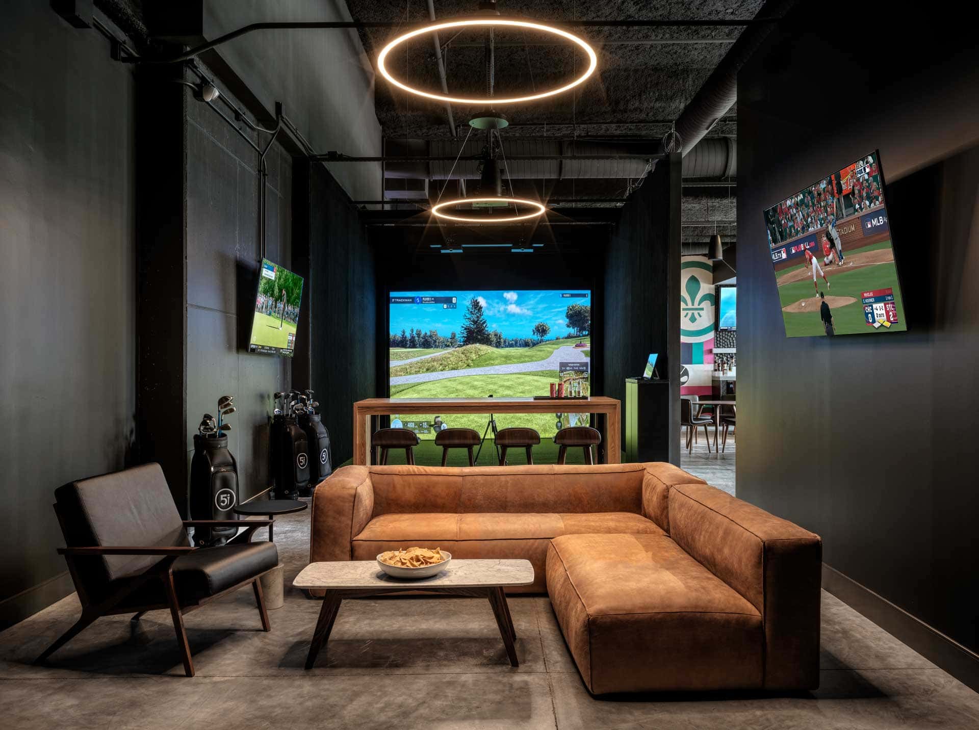 Five Iron Golf Clayton is a premier golf bar experience in the St. Louis metro area. Featuring all-in-one indoor golf and entertainment, Five Iron combines elite golf technology with a vibrant social atmosphere to create a world-class one-stop-shop for fun in Clayton. The 8,300 square foot facility features 10 premium Trackman simulator bays with multiple high-speed cameras. Access 200+ PGA Tour venue courses while competing against up to five friends. Or, enjoy lower stakes golf minigames like closest-to-the-pin and capture-the-flag challenges. For golfers wanting to seriously improve their game, our virtual golf simulators come with on-site, PGA-certified coaches. Come in for a structured Swing Evaluation or custom Callaway Tour Fitting club fitting, both designed to drop your scores, and quickly! Plus, our indoor sports lounge keeps the vibes high with a chef-curated menu and a full-service bar featuring craft cocktails and local beers on tap. With tabletop games, multi-sport simulators, and more, Five Iron Golf of Clayton offers something for everyone while revolutionizing the St. Louis metro area’s golf bar scene.